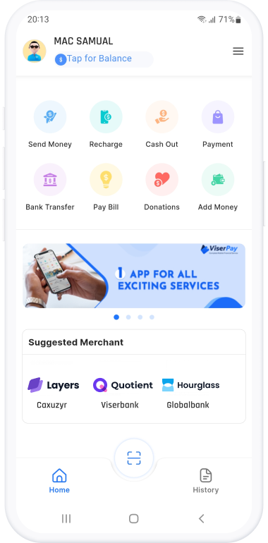 Choisissez ViserPay pour élever vos expériences financières. Bénéficiez de transferts d'argent rapides, de paiements de factures sans tracas, d'un système de retrait simple, de transferts d'argent par QR code transparents, d'ajouts de fonds sans effort et de recharge mobile simple. Notre plateforme centrée sur l'utilisateur priorise la sécurité avec des fonctionnalités multiniveaux, assurant commodité, efficacité et tranquillité d'esprit dans la gestion de vos finances. Faites confiance à ViserPay pour un voyage financier supérieur et sécurisé.